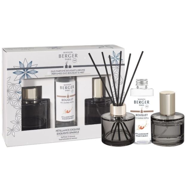 Breng een vleugje luxe en feestelijke frisheid in huis met de Maison Berger Mini Duo Set Rosalie – Exquisite Sparkle. Deze verfijnde set bevat twee elegante geurverspreiders in compact formaat: een diffuser met parfumsticks 80 ml en een roomspray 50 ml. Ideaal voor kleinere ruimtes of als perfect kado. De geur Exquisite Sparkle is een levendige, sprankelende compositie die opent met frisse grapefruit en een bruisend champagneakkoord. In het hart vind je elegante rozen en patchouli, terwijl de geur warm afsluit met viooltjes en muskus. Een feestelijk, licht en verfijnd parfum dat elke ruimte opfrist en verlevendigt. Inhoud van de set: