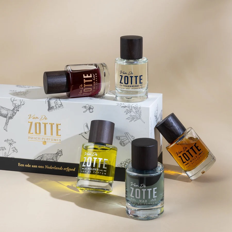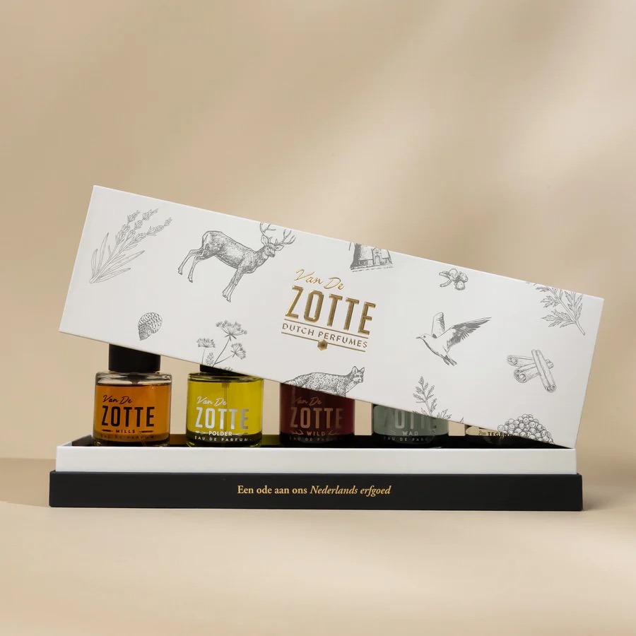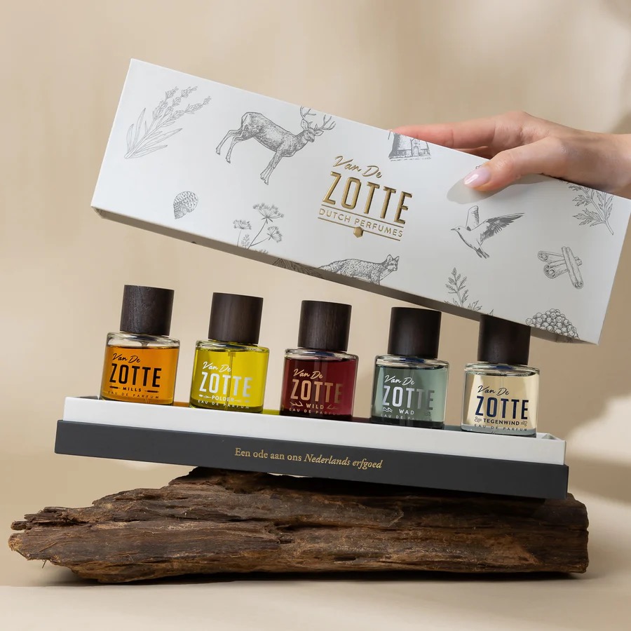 Ontdek de vijf Erfgoed geuren van Van De Zotte: onze vijf 50ml Eau de Parfums, prachtig verpakt in een luxe geschenkdoos. Elk parfum vertelt een geurend verhaal over ons Nederlands erfgoed: WADvangt de zilte ruwheid van de Waddenzee, POLDERademt het vruchtbare, van de zee terugveroverde land. MILLS eert de geur van de specerijenmolens uit de Gouden Eeuw, WILD neemt je mee naar oerbossen vol mos, blad en wilde dieren en TEGENWIND heeft het gevoel van tegenwind gevangen zoals alleen Nederlanders dat kennen.